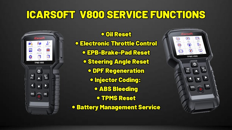 The iCarsoft V800 is not just a TPMS programming tool though, it can also diagnose ALL SYSTEMS, systems like ENGINE, ABS, AIRBAGS, TRANSMISSION, PARKING SENSORS, RADIO, DOORS, WINDOWS, SUSPENSION, POWER STEERING, AIR CONDITIONING, INSTRUMENT CLUSTER & much more.